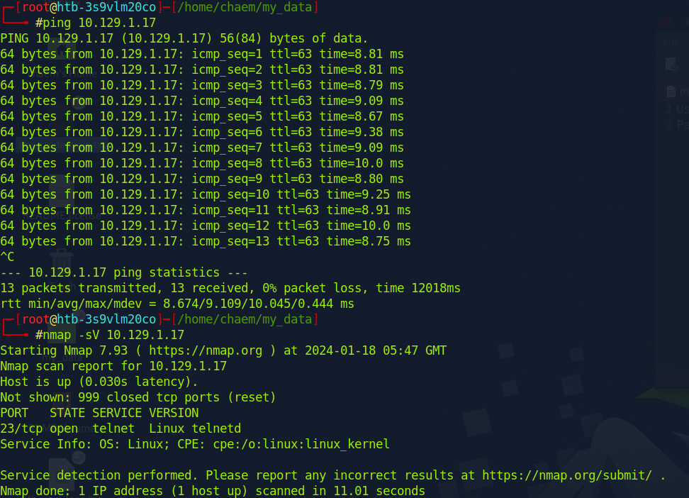 telnet 포트가 열려있는 것을 확인할 수 있고, telnet 으로 접속을 시도한다. root 계정으로 바로 접속이 된다.