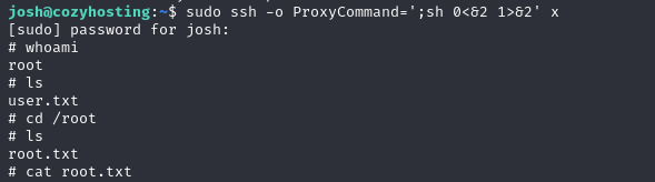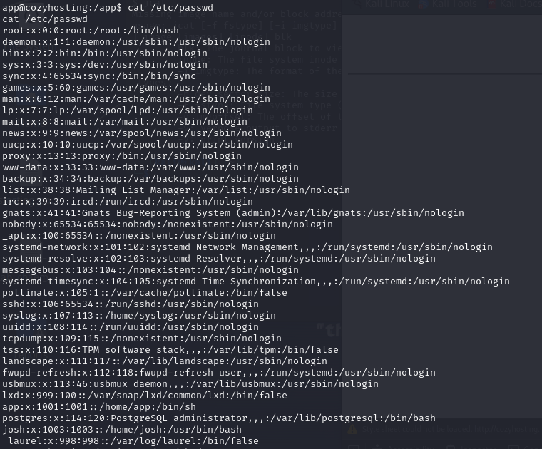 이 전을 보면, 로그인 가능한 상태의 josh라는 계정이 있다. 해당 계정에 크랙한 패스워드를 입력하면 로그인이 가능하다.
