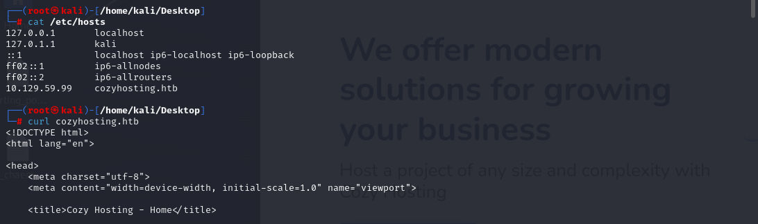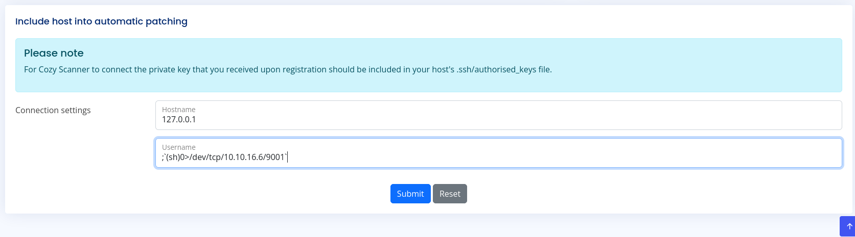 아래 보면, hostname과 username을 입력하는 창이 있다. hostname에는 localhost, 127.0.0.1, cozyhosing.htb, htb's IP 등을 넣으면 정상 동작하는 것을 알 수 있었다. 그리고 username에서 Command Injection이 가능함을 확인할 수 있다.