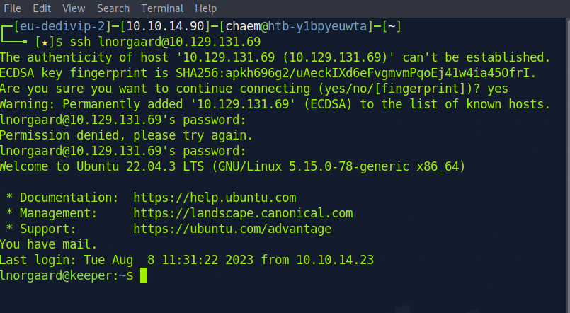 해당 계정으로 ssh 로그인을 할 수 있다. (여기서 갑자기 ssh접속이 안돼서 엄청 헤맸다... 혹시나해서 OpenVPN을 이용하지 않고 PwnBox를 사용해보니, 접속이 가능했다.. *이럴땐 OpenVPN의 서버 위치를 변경해주면 해결된다고 한다*)