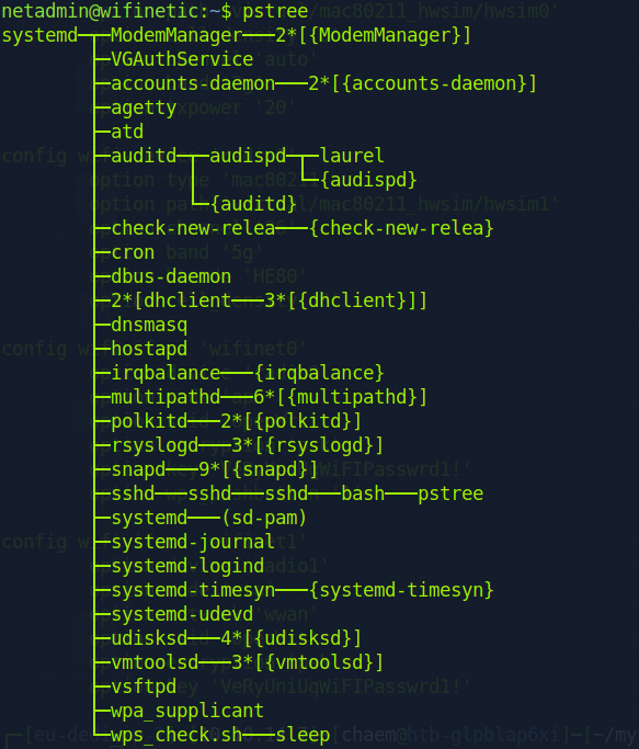 힌트를 보니, 실행중인 서비스 목록을 보라고해서 pstree 명령어로 실행중인 서비스를 확인했다. 찾아보다가, hostapd는 네트워크 인터페이스 카드를 AP 또는 인증 서버 역할을 할 수 있게하는 데몬이라는 사실을 알게 되었다.