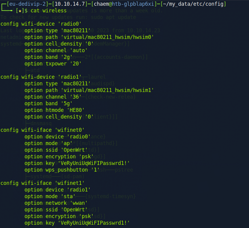 /etc/config/wireless 파일에서 다음과 같은 패스워드를 발견할 수 있었다. 이 패스워드로 어떻게 해야하나 했는데,, /etc/passwd에 있던 계정들에 해당 패스워드로 로그인이 되는 것이 있는 지 확인하라고 한다.