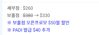 https://balibada.tistory.com/23( 오픈워터 다이버 자격증 표시가 $450, 할인가 $350)