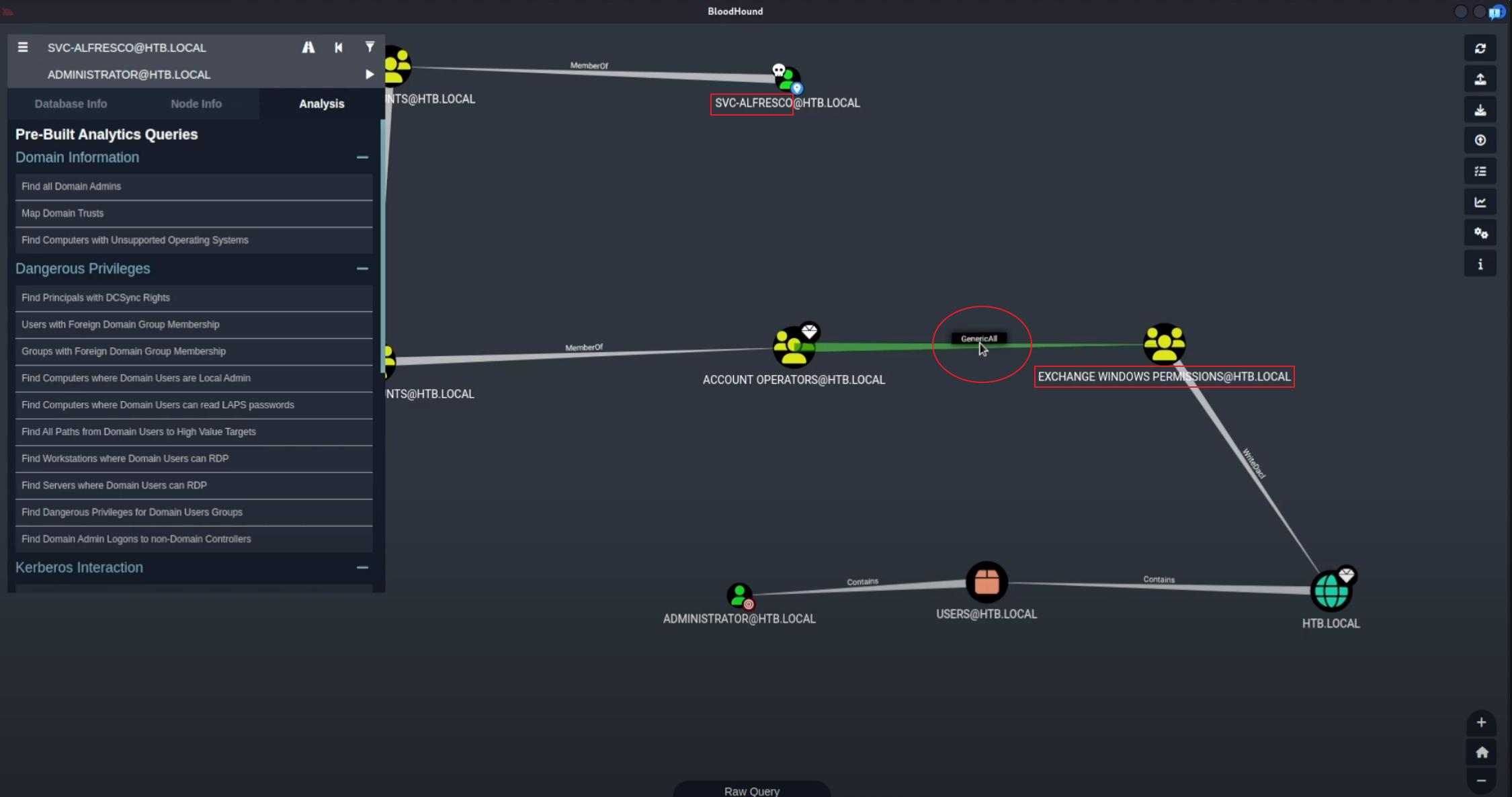 2. EXCHANGE WINDOWS PERMISSIONS@HTB.LOCAL 그룹에 <-- svc-alfresco user를 넣어야 함.