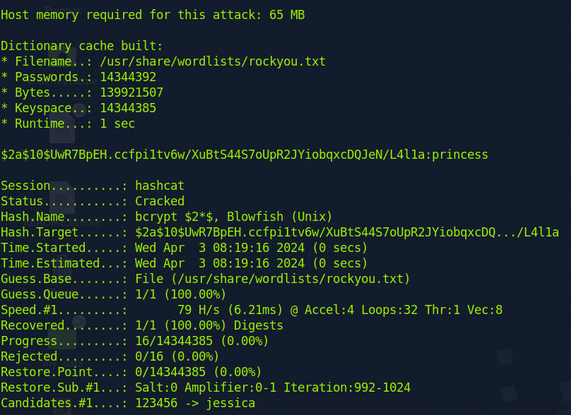 맨 아래보면, 패스워드 해시값이 있다. bcrypt로 되어 있어 -m 3200 옵션을 사용해서 해시를 크랙해보자