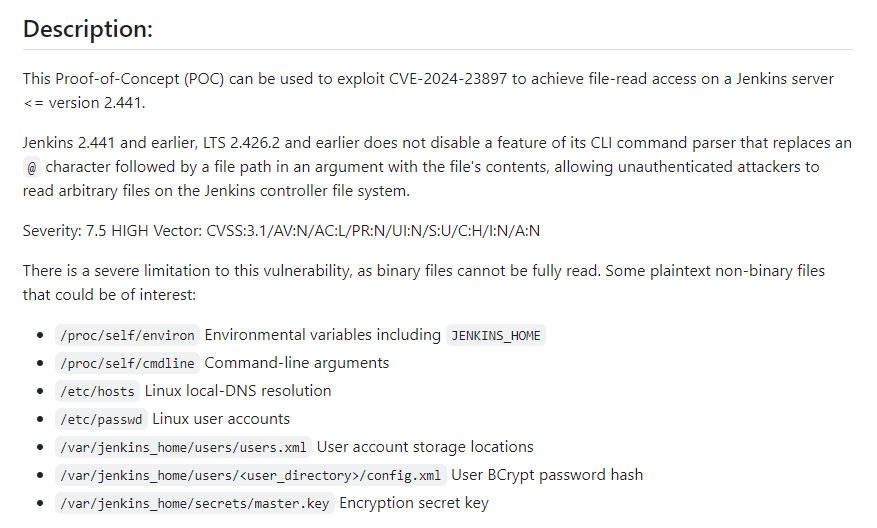 According to Jenkins Security Advisory 2024-01-24 : Jenkins uses the args4j library to parse command arguments and options on the Jenkins controller when processing CLI commands. This command parser has a feature that replaces an @ character followed by a file path in an argument with the file’s contents (expandAtFiles). This feature is enabled by default and Jenkins 2.441 and earlier, LTS 2.426.2 and earlier does not disable it. This allows attackers to read arbitrary files on the Jenkins controller file system using the default character encoding of the Jenkins controller process.