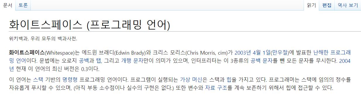 whitespace 언어에 대해 찾아보니, 위키에도 있었당! 이런 재미있는 언어가 있다닝…