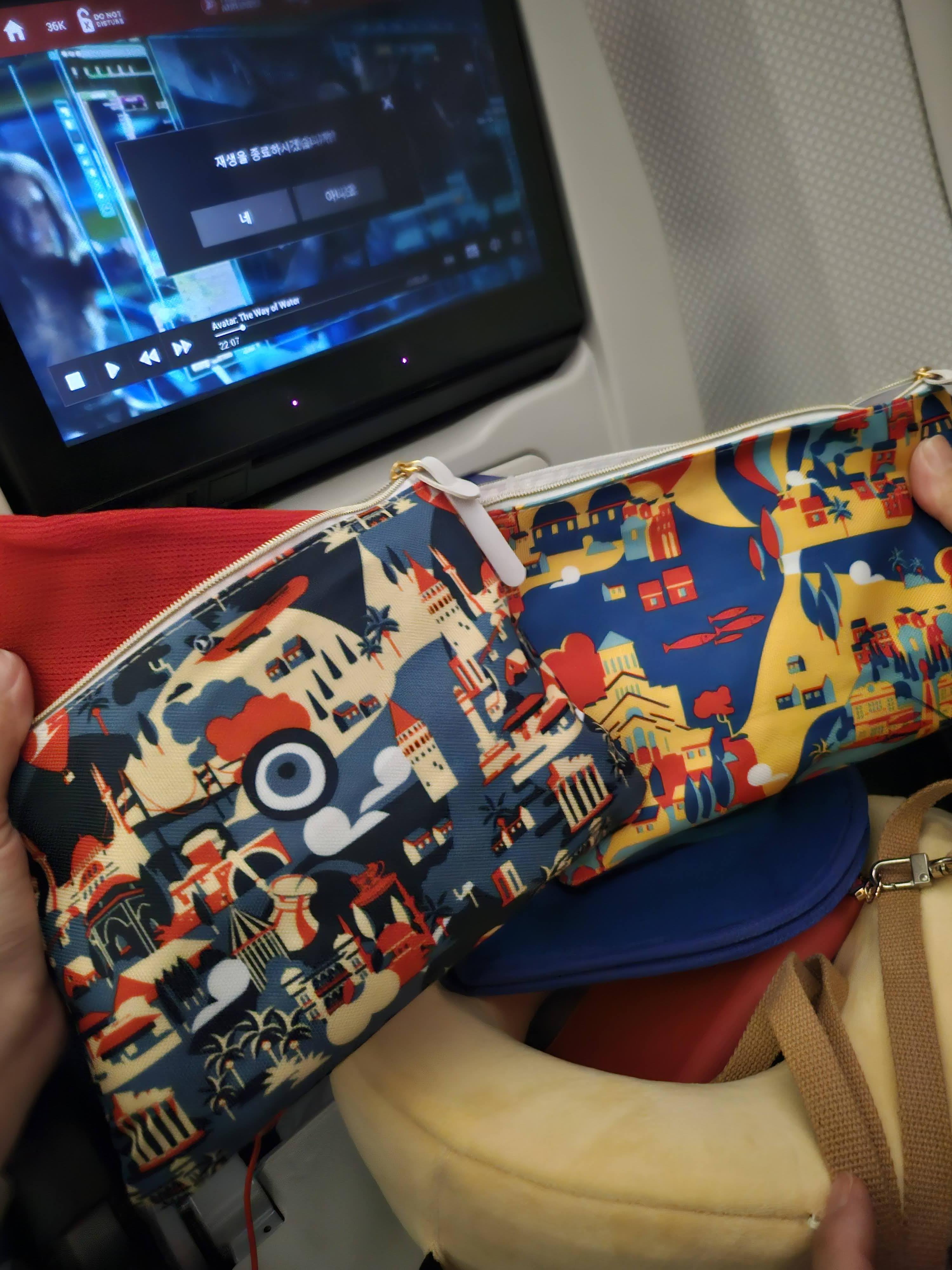 이제 비행기에 탑승! 긴 여정이 될 것이당 목배게랑 만만의 준비를 해왔다! 밤비행 시작! 아, 우리의 비행기는 터키항공이었다! 좌석은 넓진않았지만,,, 파우치가 너무 귀엽고 기내식도 맛있었다!