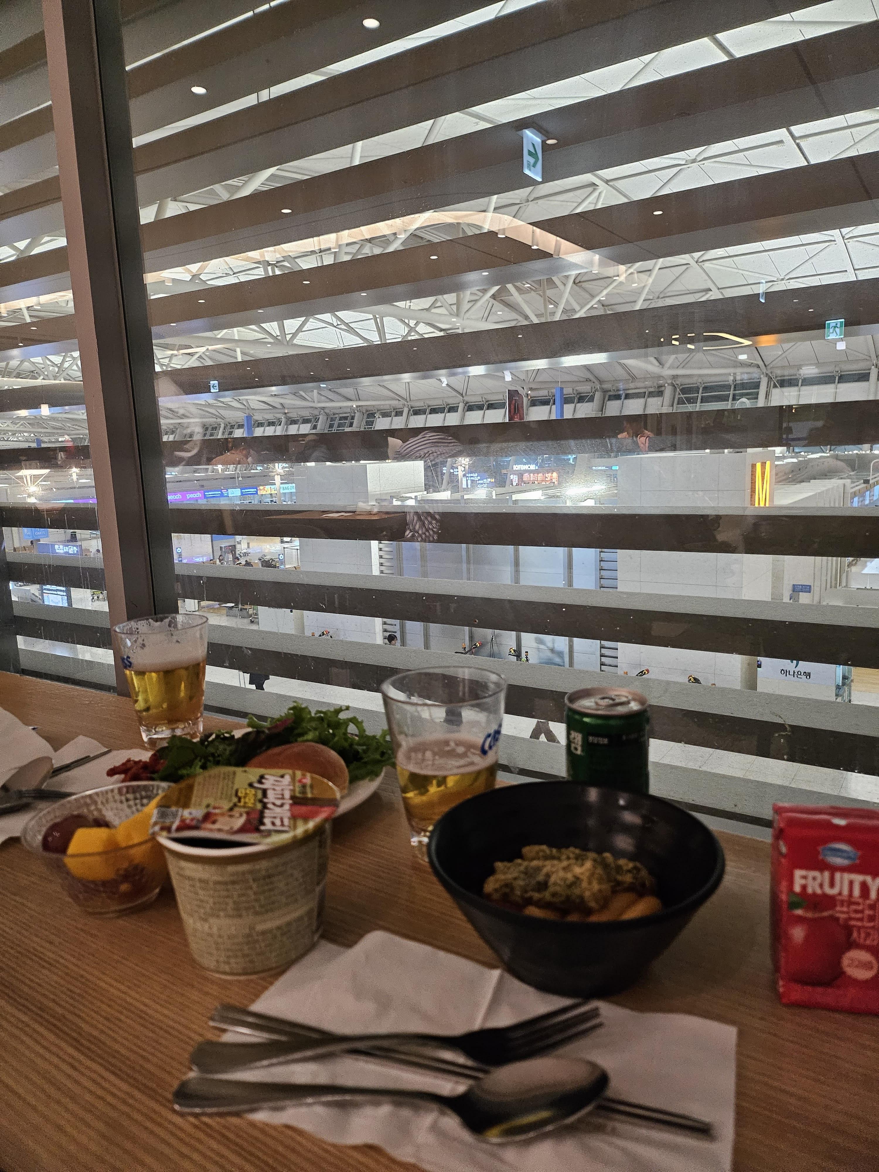 그렇게 수속 절차를 밟고! 입국 심사 전에 이미 순두부찌개를 먹었지만, 라운지를 이용하기 위해 미리 롯데카드도 만들어뒀기 때문에 ㅎㅎ 공항 라운지로 바로 향했다! 마감시간이 얼마 안남았기 때문!!!! 라운지음식도 간식거리하기 좋은 음식들이라서 더 먹을 수 있었다ㅎㅎㅎ 마감까지 30~40분 정도 남았던 걸로 기억하는데, 생각보다 여유로웠다. 맥주도 한잔씩 하고~~~ㅎㅎ