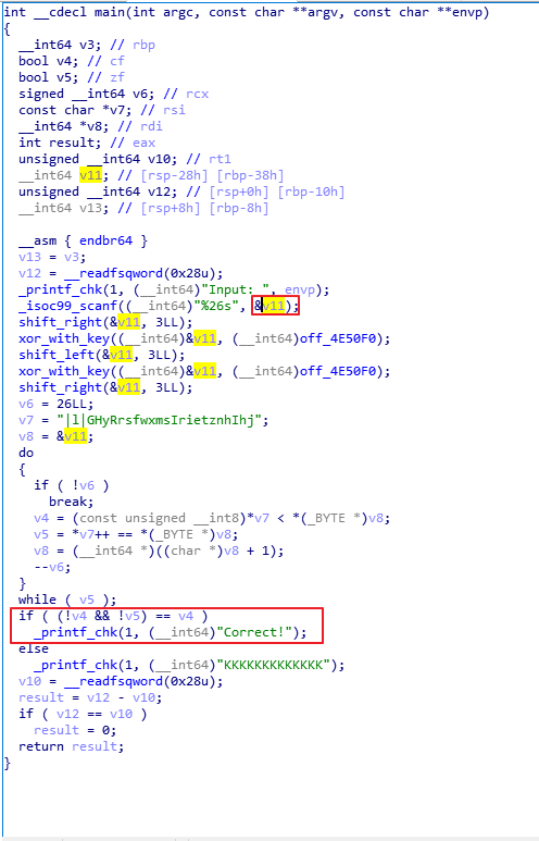 IDA로 main을 보니, 문자열을 받아와 연산을 하고 그 값이 특정 값이면 Correct로 간다. 처음에 입력되는 값이 flag인 것 같고, 역연산을 하면 될 것 같다.