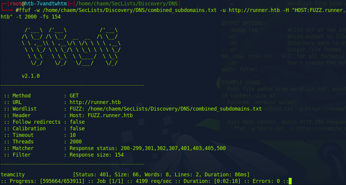 ffuf -w /home/chaem/SecLists/Discovery/DNS/combined_subdomains.txt -u http://runner.htb -H "HOST:FUZZ.runner.htb" -t 2000 -fs 154