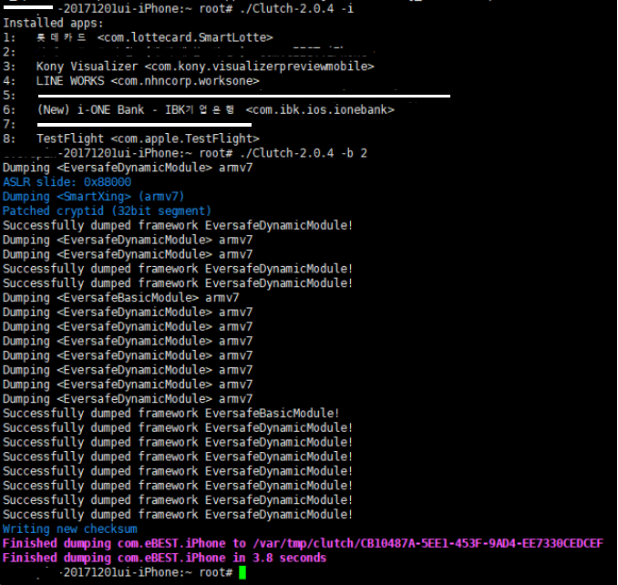 - 위의 내용에서 보이는 숫자를 이용해 ./Clutch -b 숫자 를 입력하게 되면 알아서 Decrypte 진행한다.
