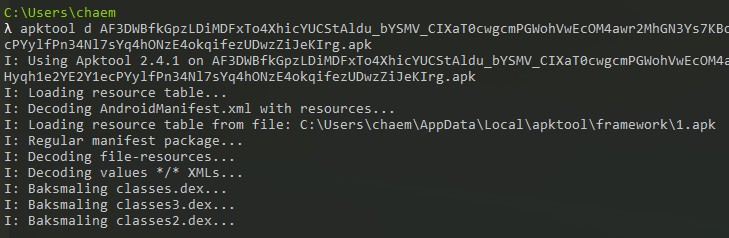 디컴파일 시, apktool d [option] [decode할 파일명].apk (또는 java -jar apktool.jar d [option] [decode할 파일명].apk) 명령어를이용한다.