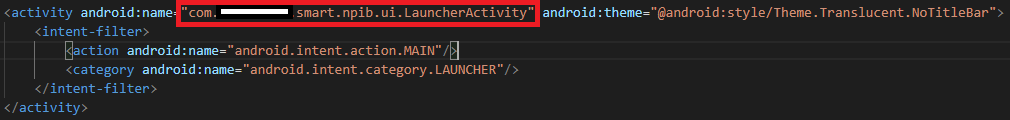 해당 태그가 있다면 <activity android:name=""> 액티비티 태그에 android:name을 찾는다. 이 부분이 해당 name이 처음 구동되는 activity name이다.
