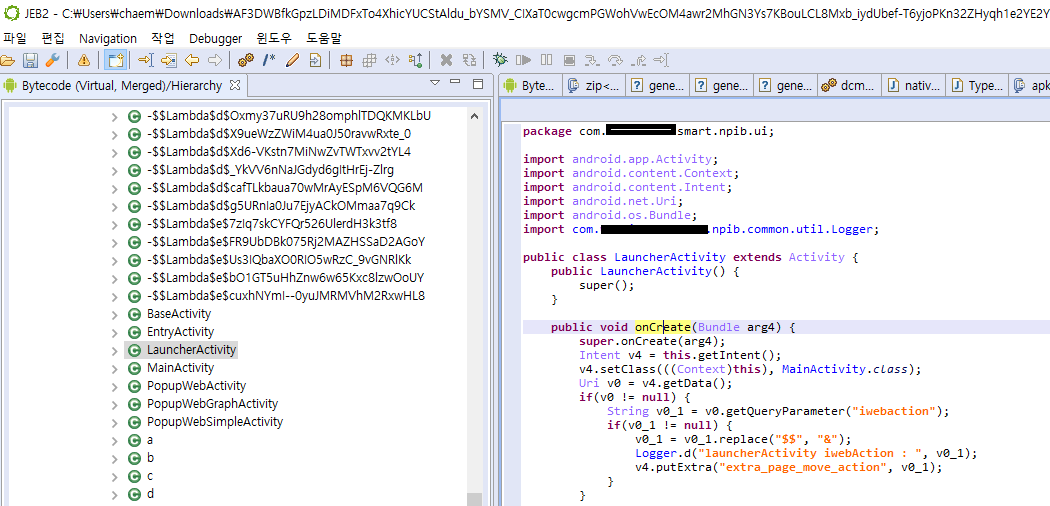 저 경로로 가면, 다음과 같이 onCreate를 발견할 수 있다. 이 부분이 처음 구동되는 activity라고 볼 수 있다.